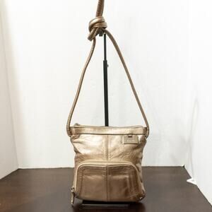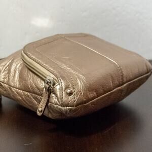This Tignanello bag would be a great accent to a wedding outfit, as well as while you are shopping or traveling. It is gold genuine leather with beige lining. On the inside there is 1 slip and 1 zip pocket. The exterior has a zip around organizer with 6 credit card slots, 1 zip, and 1 slip pocket. The hardware is silver, the strap is a crossbody and it has a zip closure. This is bag is in great condition. 9" (H) X 8.5" (L) X 1.5" (D) with a 23" strap drop.