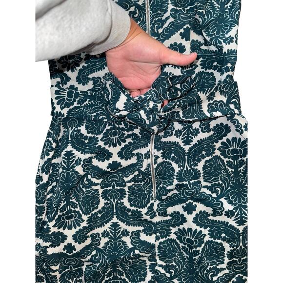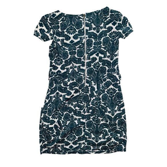 Women’s Small Damask Print Dress Green White Short Sleeve Waist Tie Back Zip