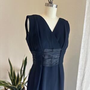 Stunning vintage 1960s two-piece set in deep navy blue. Includes a sleeveless midi dress and matching long sleeve cropped jacket with a Peter Pan collar and fabric-covered buttons. The look is timeless and tailored — think Jackie O meets retro mod.