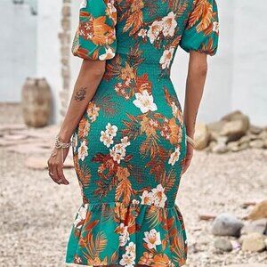 Women's Small Floral Midi Bodycon Dress Midi off shoulder Derby Puff Sleeve Ruffle Hem Mermaid