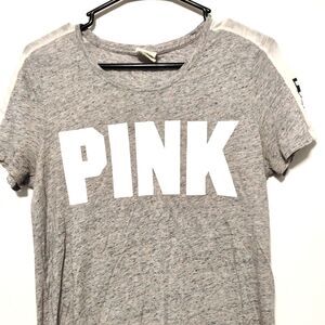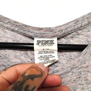 Embrace effortless style with the PINK Victoria's Secret campus shirt, a charming addition to your everyday wardrobe. This women's size small, gray ringer T-shirt, features a playful and colorful graphic design that captures the essence of the brand's signature themesUniversity, Colorful, and Love. It's crafted from soft, 100% cotton knit fabric, ensuring comfort and breathability for all-day wear.