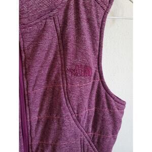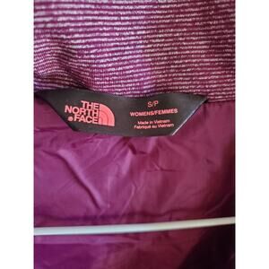 The product is a women's The North Face vest jacket in a maroon burgundy color, size small. It is made of polyester outer shell material and lined with nylon. This sleeveless jacket features a zip closure, regular fit, and comes with zipper and logo accents. The North Face Pseudio Puffer model is ideal for travel, casual, and workwear occasions, providing warmth with its insulated polyester material. This classic outdoor sports-themed jacket also includes pockets for added functionality. Easy to care for with machine washable garment care instruction.