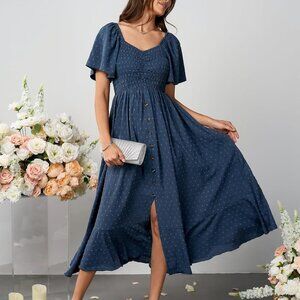 Features: Beautiful floral maxi dress with a sweetheart neckline and smocked front that hugs your curves in all the right places. The flutter sleeves add a delicate touch, and the button-down skirt with a split hem keeps the look modern and breezy.