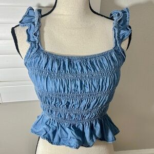 Women’s Smocked Tank Top Size S Ruffle Short Crop Solid Blue Shirt Cottage