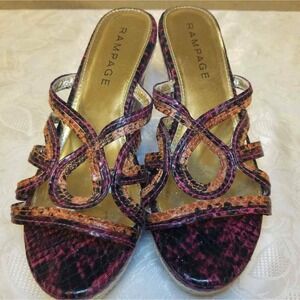 Rampage Multicolor Snake Print High Heel Cork Wedge Slides Sandals, the perfect combination of style and comfort. These stunning sandals feature a playful and bold multicolor snake print pattern that is both eye-catching and versatile. Slip into these sandals with ease thanks to their convenient slip-on design, perfect for those busy mornings or casual outings. Standing tall on a high wedge heel, these sandals create an elongated silhouette while still maintaining comfort. The cork material used for the wedge ensures a lightweight and cushioned feel with every step. Crafted with expert craftsmanship and high-quality materials, these Rampage sandals are a reliable choice for any occasion. Whether you're dressing up or down, the animal print pattern adds a touch of playful sophistication to any outfit. Available in size 10, the Rampage Multicolor Snake Print High Heel Cork Wedge Slides Sandals are the perfect choice for the fashion-conscious woman who demands both style and comfort.
