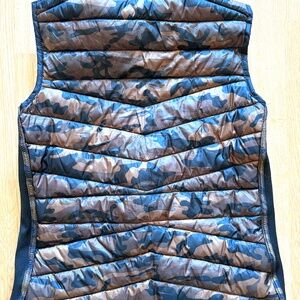 Fully reversible vest with dark camo on one side and solid black on other.zippered pockets on both sides. Nylon and polyester
