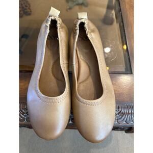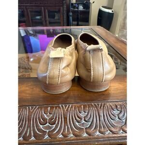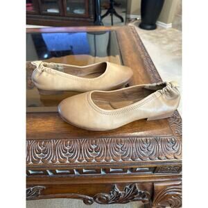 Tan leather flats with a slight distressed look. Leather is soft. Elastic on the heel