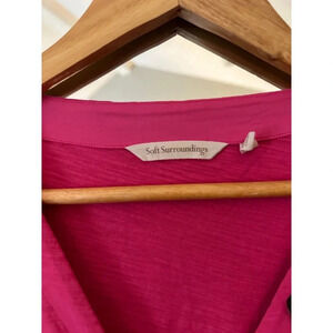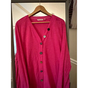 Pre-owned Soft Surroundings women's 1X long-sleeve button-down shirt. The hot pink shirt is made of a textured knit fabric. It features a V-neckline and unique decorative buttons. Measurements are not provided. The shirt shows no significant flaws; it is in good condition. Made in China.