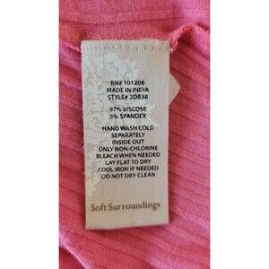Women's Soft Surroundings Pink Button Down Ribbed Short Sleeve Shirt. Size medium. 97% Viscose 3% Spandex. Super soft and flattering! Has a lettuce hem, collar, and around the sleeves. Ribbed material that is so soft! Also has a cut out of not ribbed material for a flattering look!