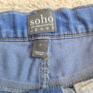 These are pre-owned Soho New York & Company denim shorts, size 2. The shorts are light blue with a distressed look, featuring frayed hems and intentional rips on the front. They have a standard five-pocket design with a button and zipper closure. The material composition is 79% cotton, 20% polyester, and 1% spandex. There are no significant stains or tears beyond the intentional distressing.