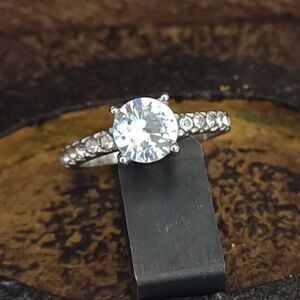 This ring has a round cut main gem flanked round cut paved gems in the band.