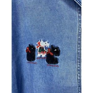 This lovely women's shirt features a charming dog theme and is made of 100% cotton for comfort and easy care. The shirt has a relaxed fit and a button-up closure with accents, and the neckline is collared. It's perfect for a variety of occasions, including travel, parties, casual wear, and business settings. The shirt is a size L and is machine washable.