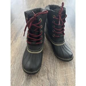 This pair of Sorel Joan of Arctic winter boots, featuring black leather uppers, faux fur lining, and waterproof construction. This boot has red laces, a rubber lower section, and a stacked heel, making them suitable for cold and wet weather. The Sorel branding and model information are visible on the heel confirming authenticity. These are a women's size 7.