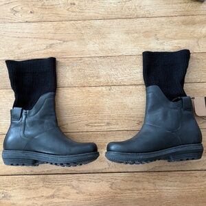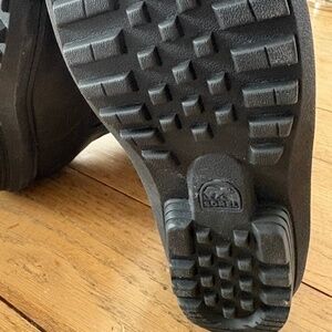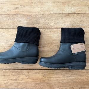 Sorel Juneau winter boots have an extended knit wool lining that can be worn up for added warmth over the lower leg or folded down over the boot upper. Waterproof materials and construction.
