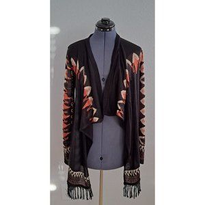 This is an open front waterfall style long sleeve cardigan, lightweight. Aztec/ Native American/ Southwest style design in the knit. Colors are Black, Clay, Ivory and Gray. Very lightweight, thin, great for layering. There are no tags - brand, size or otherwise. The measurements will tell us what approximate size it is and more importantly, how it will fit on you. It appears to be closest to a Ladies' size large.