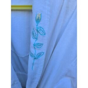 Women’s Spa/Hotel Style Robe – White Cotton Terry, Embroidered Leaves (Small)