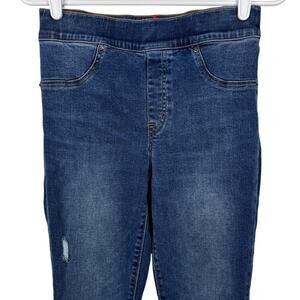 Women's Spanx Blue Distressed Denim Ankle Skinny High Rise Raw Hem Stretch Jeggings Pull On Legging sz Medium