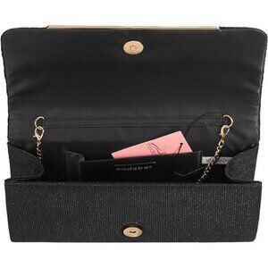 Made of glittering high-density polyester with satin lining ensures lasting elegance. Magnetic closure secures essentials in this black clutch.