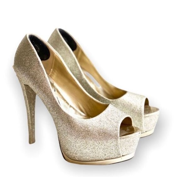 Womens Speed Limit 98 Gold Shimmer Glitter Open Toe Pumps Heels - Sz 8
