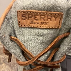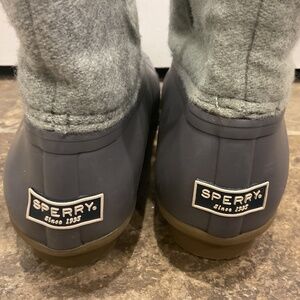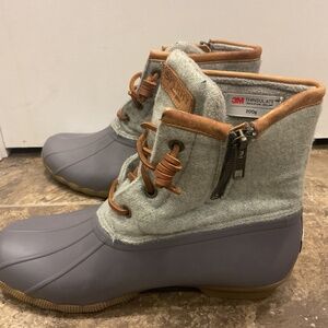 Saunter through the season in the weather-ready style of the Sperry saltwater, duck-inspired, waterproof, rubber boot. Embossed wool upper. Rawhide lacing with rust-proof eyelets for a secure fit. Side zipper closure for easy on and off. Fleece lining and cushioned insole for warmth and comfort. Non-marking rubber outsole with traction on wet and dry surfaces. Very good used condition. Women’s size 8.