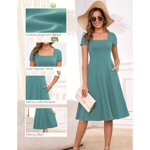 Features: This flowy A-line midi dress features a cute square neck, short sleeves, and practical pockets — a stylish and functional combo. The fit and flare silhouette creates a flattering shape, while the knee-length design is both trendy and modest. Easy pull-on closure makes it a breeze to wear all day.
