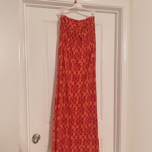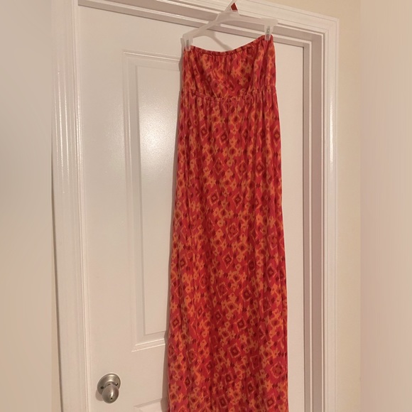 Adorable Women’s strapless maxi in size Medium. Colors are pink and orange with an ikat pattern. This dress is in good used condition! No holes or tears. Maybe some slight piling. Great for Spring and Summer!!