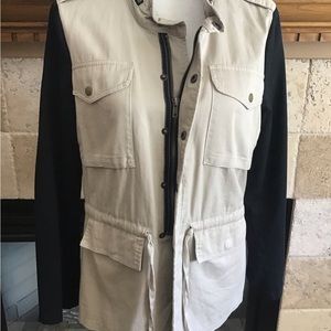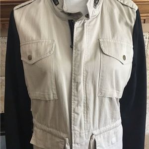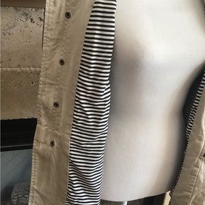 So cute women’s Danielrainn jacket. So stylish with striped lining and drawstring waist. 4 front pockets. Sleeve length shoulder to bottom of sleeve 22 inches. Collar to hem 29 inches. 100% cotton.
