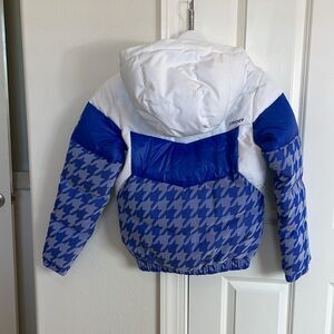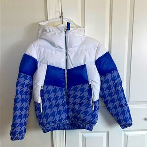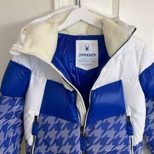 Perfect! Worn once for 4 hours! Super warm - down filled. Sherpa lined hood. Smoke free / pet free home.