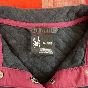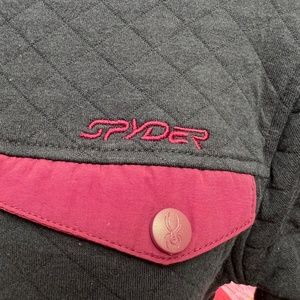 Features foldable neck cuff for warmth, button logoed snap closures, front button pocket, gorgeous quilted material, purple / maroon detailing, and well preserved Spyder logos.