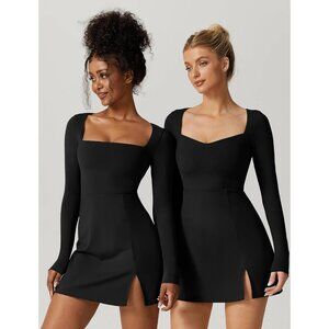 Women's Square Neck Bodice Dress Long Sleeve Side Slit Flare Mini