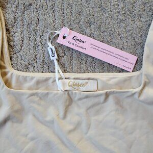 This women’s square neck bodysuit is designed for a sleek, slimming look while remaining comfortable and breathable. The double-lined cream fabric ensures opacity and a smooth fit, making it a versatile wardrobe essential.