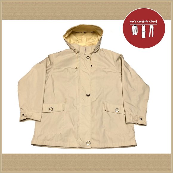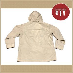 Women's St. John's Bay brand beige coat size X-Large (plus size approx close to a 1X). In good condition with no tears but that are a few areas with some minor stains refer to the last 3 photos. Measurements are: armpit to armpit is 26 inches and the length is 29 inches long. This is a zip-up coat that also has a flap-to-button as well. There are two pockets in the front and a hood that can be removed. Comes from a smoke free home.