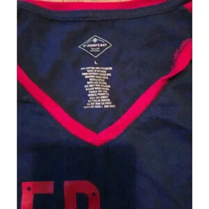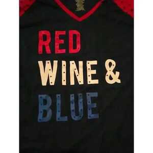 This is a pre-owned women's short-sleeved t-shirt from St. John's Bay. It is size L and is made of 60% cotton and 40% polyester. The shirt is navy blue with red and white raglan sleeves that have a black star pattern. The front of the shirt has a white, red, and blue graphic that reads "RED WINE & BLUE" with black stars incorporated into the letters. The shirt has a v-neck and is in good condition with no visible signs of wear or damage.