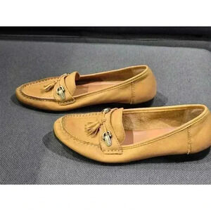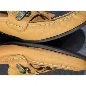 A pair of pre-owned tan leather loafers by St. John's Bay. The loafers feature a tassel detail, a silver buckle, and a stitched design. The shoes are size 6 1/2 M and have a leather upper with a balance manmade construction. They were made in China. The shoes show signs of wear, including scuffs and scratches on the leather. The soles are also worn, and one sole looks slightly separated from the leather but still attached. The shoes are in fair condition.