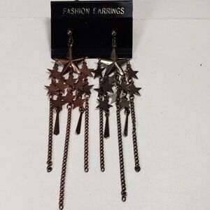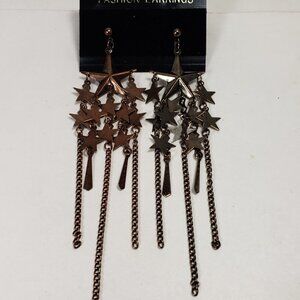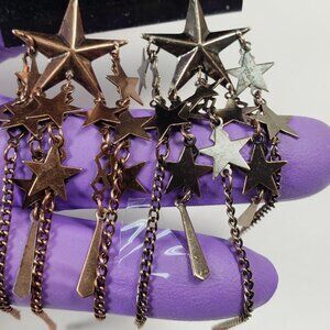 Make a stellar style statement with these women's star design with drop stars and chain statement earrings. The post-drop dangle design features a captivating star design with dangling stars and delicate chain accents, creating a celestial-inspired look. With a 4-inch drop length, these earrings add a touch of elegance and drama to any outfit. The star motifs symbolize dreams, inspiration, and a touch of magic, making these earrings perfect for those who love to shine and stand out. NWT