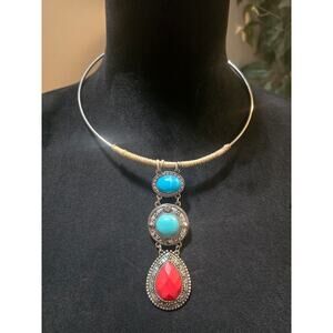 Women's Statement Necklace With Turquoise And Red Gemstones Lobster Claw Clasp