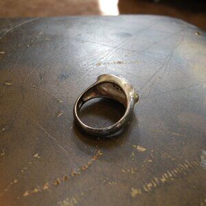 I believe this ring is a size 7. The larger iridescent gemstone in the center changes color depending on how the light hits it.
