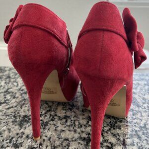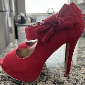 Step into style with these stunning Ollio women’s platform heels! Featuring a chic open toe design and an elegant ribbon accent, these pumps add the perfect pop of color and sophistication to any outfit. Crafted with soft faux-suede fabric and a sturdy rubber sole, they combine comfort and fashion effortlessly. The convenient back zipper closure makes them easy to slip on and off, while the 4.92" high heel gives you that confident lift you’ll love.