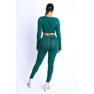 This stitch detailed, long sleeve, unique design tie front top and legging set will be a perfect addition to your wardrobe. Perfect for the activities of the day this comfortable top and legging set is great for lounging or even for working out! Wear these two pieces together or separate. Enjoy your comfort and style.