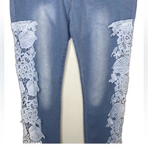 Women’s Straight Leg Jeans XXL Light Blue White Embroidered Lace Leg Distressed