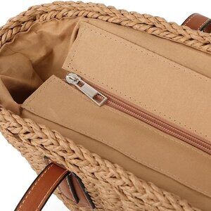 Features: Beautifully hand-woven with high-quality paper straw and a soft polycotton lining. Lightweight and sturdy, this tote offers enough space for your essentials and more. The top zipper keeps your items secure and the stylish woven pattern adds a chic summer vibe.