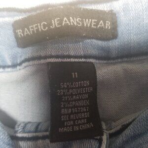 Women's Stretch Denim Fringe Traffic Jeans Wear Western Shorts Sz 11. W 17", R10.5", and Inseam 2.5" (not including fringe). 54% Cotton, 23% Polyester, 21% Rayon, and 2% Spandex. Good pre-owned condition