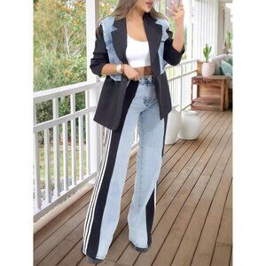 Womens Stretch High Waisted Wide Leg Jeans Patchwork Stripes Color Block