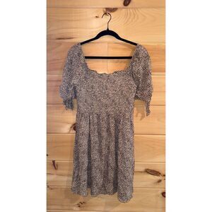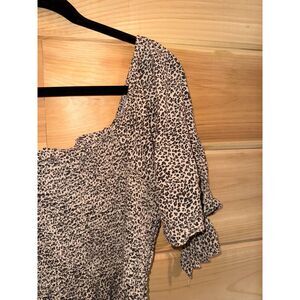 Women's stretch cheetah print mini dress from American Eagle. Very cute ties on the sleeves and lettuce edge on the square neckline. Size large. Exact measurements below.