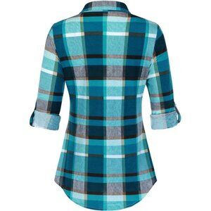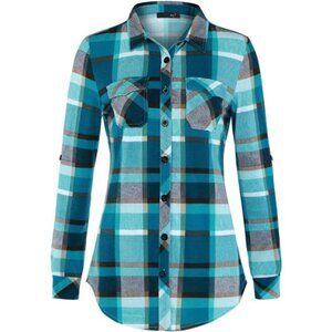 Womens Stretchy Knit Plaid Shirt - Roll Up Long Sleeve Collared Button Down