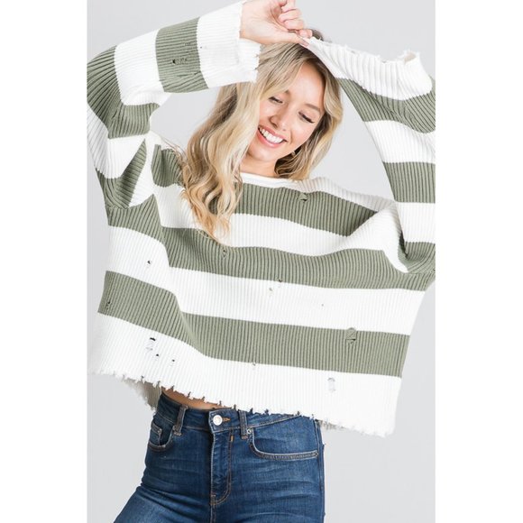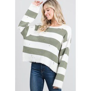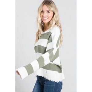Women's Striped Knit Sweater With Distressing Details (White/Olive)