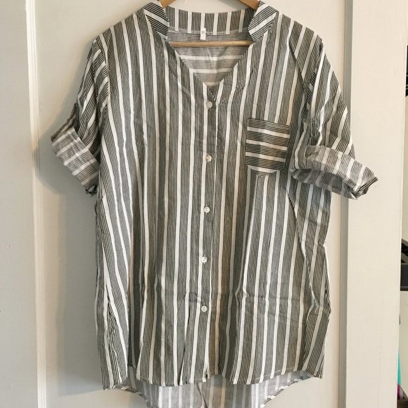 Lightweight button-down shirt with roll-up sleeves. This has Asian sizing and is marked 2X but fits like a US Large. Measures 22" between armpits and 27" from shoulder to bottom hem. Never worn.