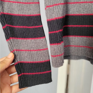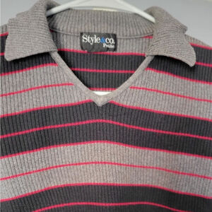 Stay effortlessly stylish in this ribbed knit sweater by Style & Co., featuring horizontal stripes in gray, black, and burgundy tones. Designed with a flattering V-neckline and soft fold-over collar, this long sleeve top blends comfort with a preppy-chic look—perfect for casual days or dressing up with layers.