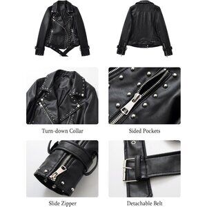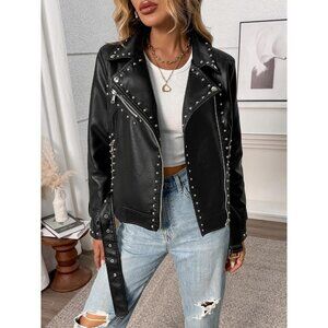 Women's Studded Faux Leather Moto Jacket Black PU Biker with Rivets Punk Black