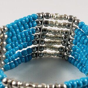 Elevate your style with our Greenish Blue and Silvertone Multi-Strand Stretch Bracelet. This versatile bracelet features multiple strands of Greenish blue and silver color beads that catch the light beautifully. It's perfect for anyone who loves to add a touch of color and texture to their outfit.